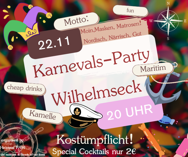 Am 22.11. 20 Uhr, öffnet das Wilhelmseck (unser Party- und Gemeinschaftsraum) die Türen unter dem Motto: „Moin, Masken, Matrosen! Nordisch, Närrisch, Gut".