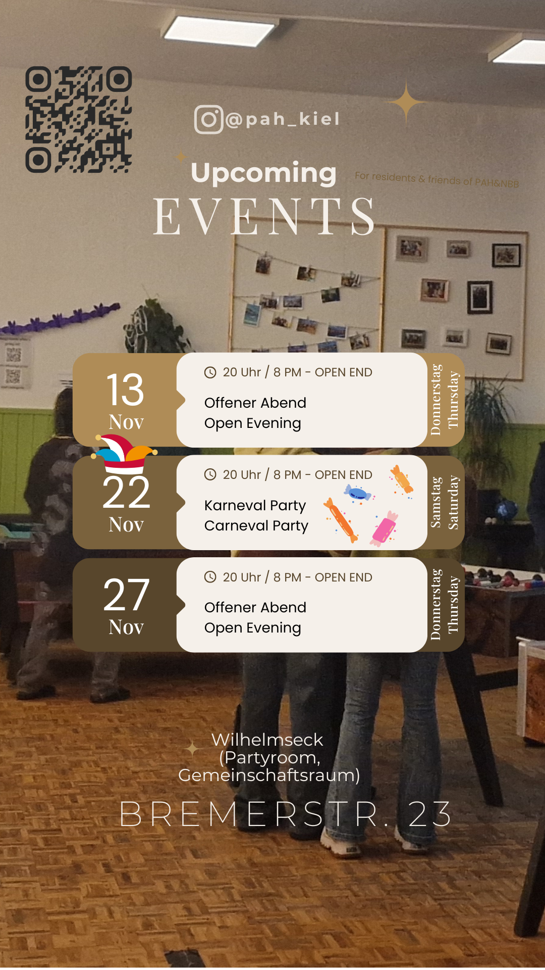 Unser Eventplan für diesen Monat! Alle Events sind für Bewohner und Freunde der Wohnheime PAH & NBB selbtverständlich preisgünstig und ohne Eintritt. Ihr habt Eventvorschläge? Dann wendet euch persönlich über die Socials oder per events@pahkiel.de an uns.