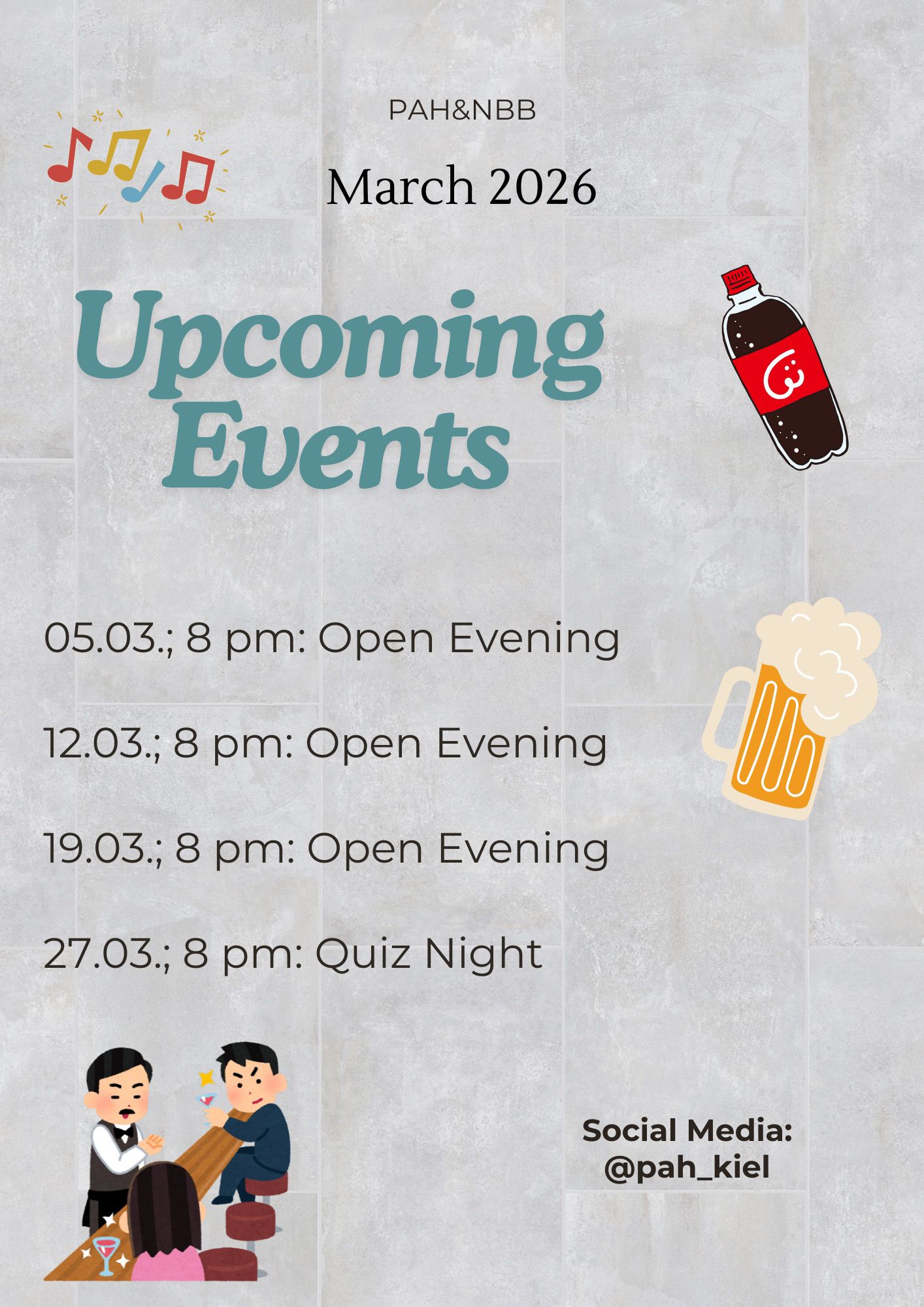 Unser Eventplan für diesen Monat! Alle Events sind für Bewohner und Freunde der Wohnheime PAH & NBB selbtverständlich preisgünstig und ohne Eintritt. Ihr habt Eventvorschläge? Dann wendet euch persönlich über die Socials oder per events@pahkiel.de an uns.